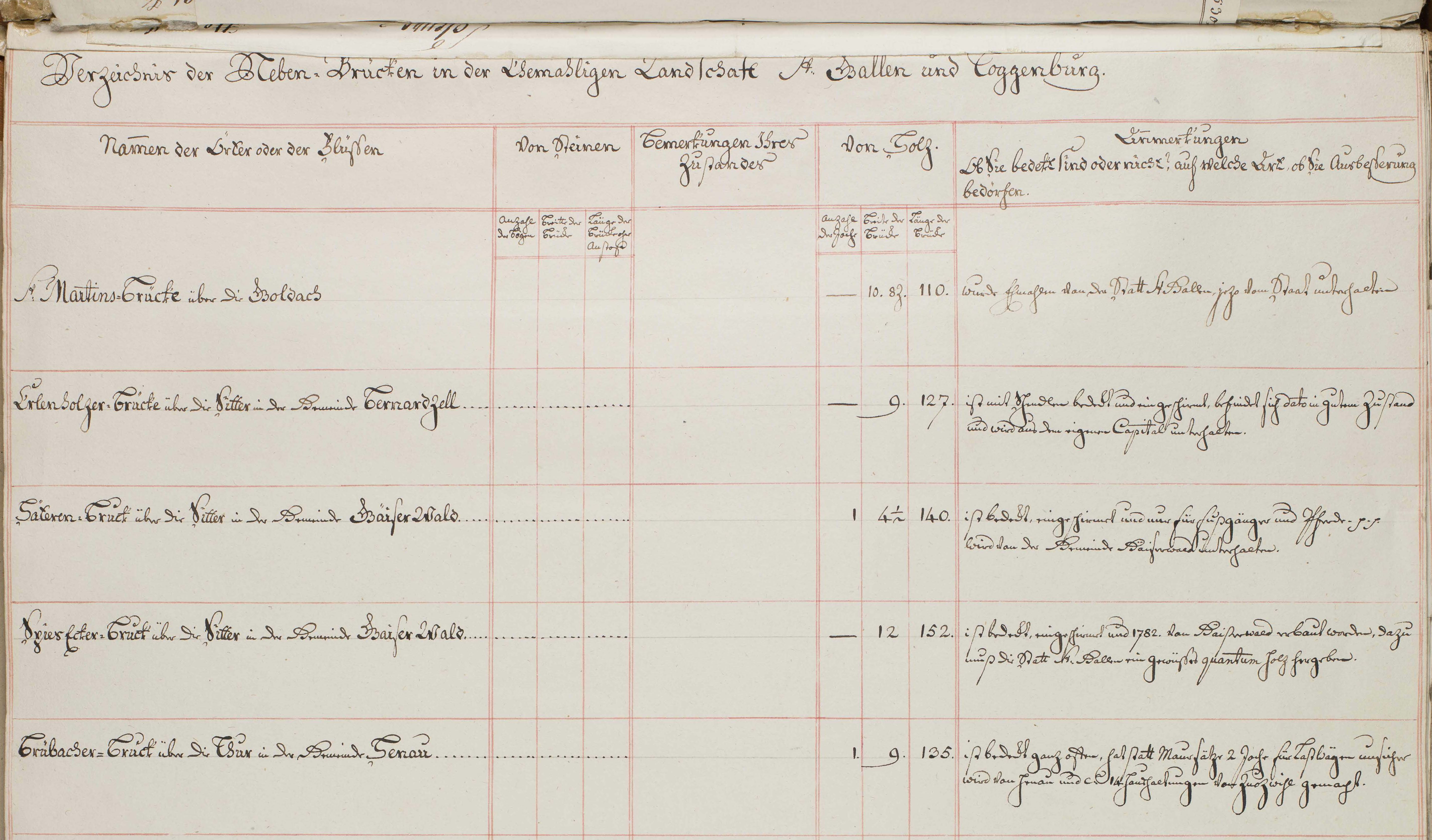 In den Beständen der Division III «Génie, Ponts et Chaussées» sind auch für 15 Kantone Brückeninventare überliefert.[1] Die über einen längeren Zeitraum vom Sommer 1799 bis November 1800 verfassten Tabellen, deuten weniger auf eine eigentliche Umfrage, sondern eher auf eine andere Art systematischer Informationserhebung durch die Zentralverwaltung hin. Sie beruhen trotz ihrer Unterschiedlichkeit auf gewissen gleichen Vorgaben, denen die Verfasser folgten. So sind alle Tabellen nach hölzernen und steinernen Brücken geordnet und weisen auch eine ähnliche Struktur und Beschriftung der Spalten auf. Bezüglich ihres Informationsgehalts sind sie ideale Ergänzungen der Resultate der Strassenenquête.