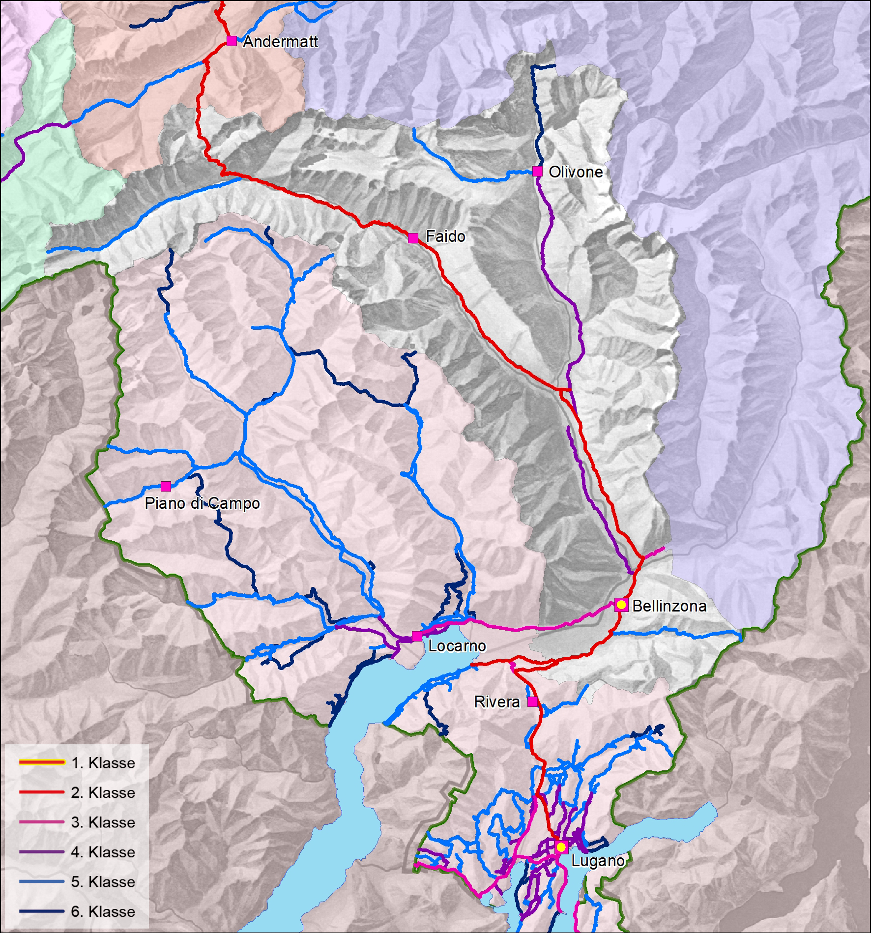 Rekonstruktion des Strassennetzes gemäss der Klassifizierungen in den benachbarten Kantonen und aufgrund der erwähnten weiteren Quellen. (GIS HSE 2018; Relief Imhof 1982)