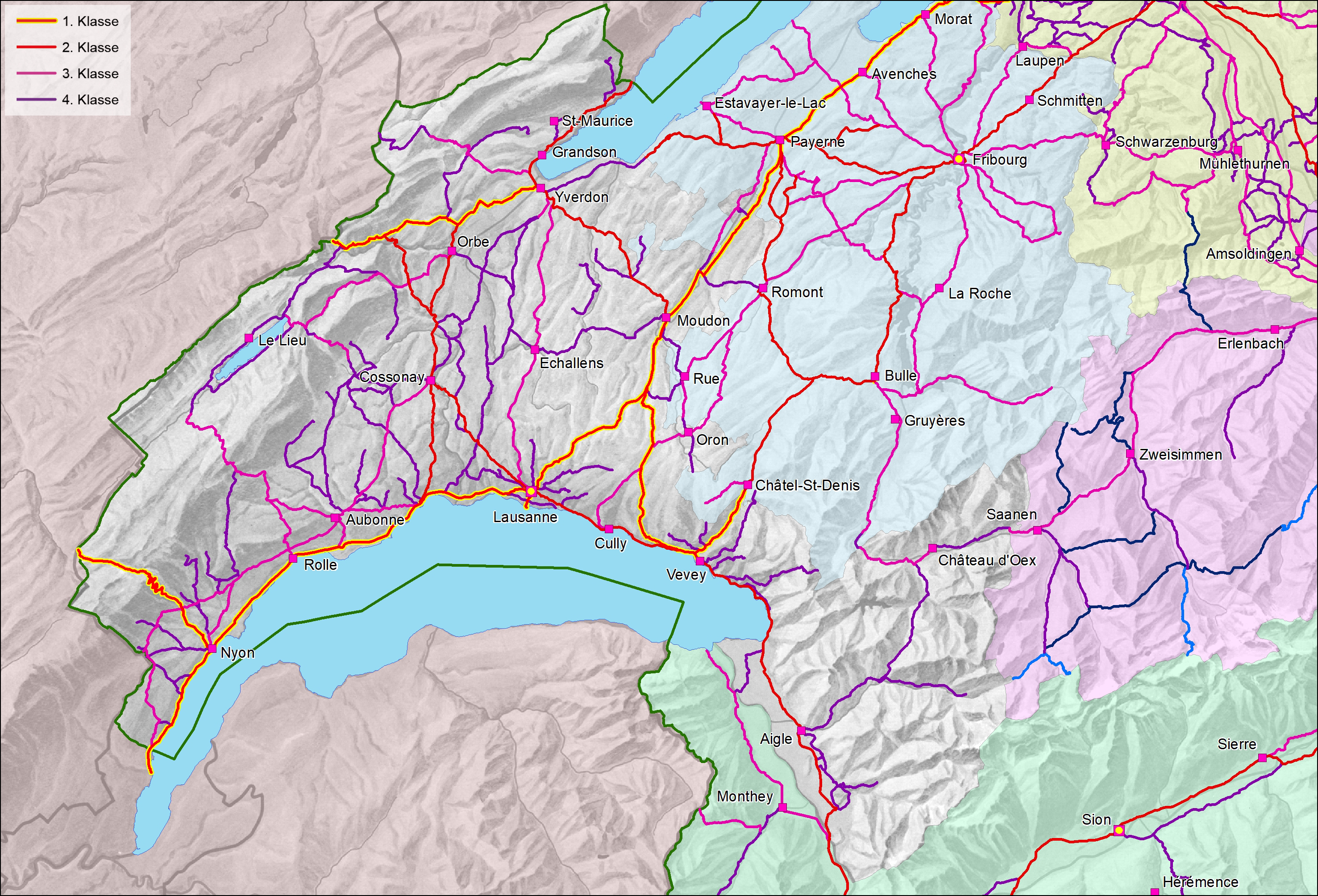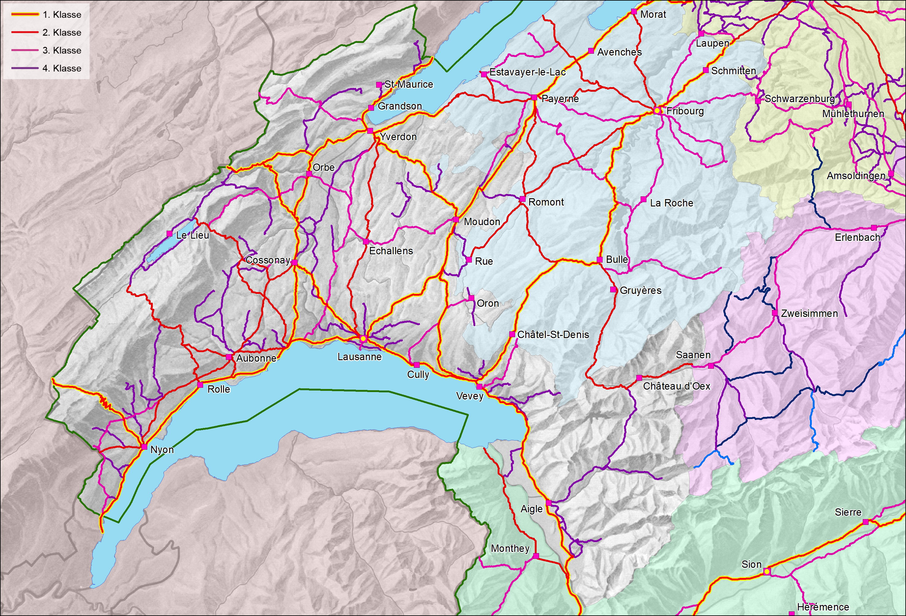 Das Strassennetz des Kantons Waadt nach der Klassifikation vom 23. Oktober 1800. Für die Mehrzahl der Strassen der vierten Klasse gab die Klassifikation vom 23. Oktober 1800 nur die Gemeinde an, durch die sie führten, nicht aber die Anfangs- und Endpunkte. Wir haben sie anhand von historischen Karten und Plänen identifiziert. Nicht in allen Fällen ist deren konkreter Verlauf jedoch gesichert (siehe Bemerkung unten; Karte GIS HSE 2018; Relief Imhof 1982).