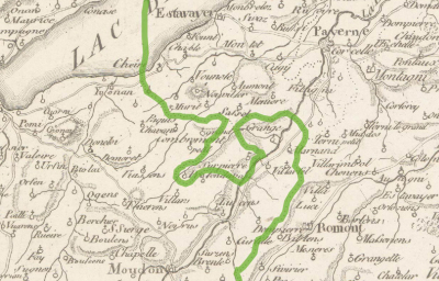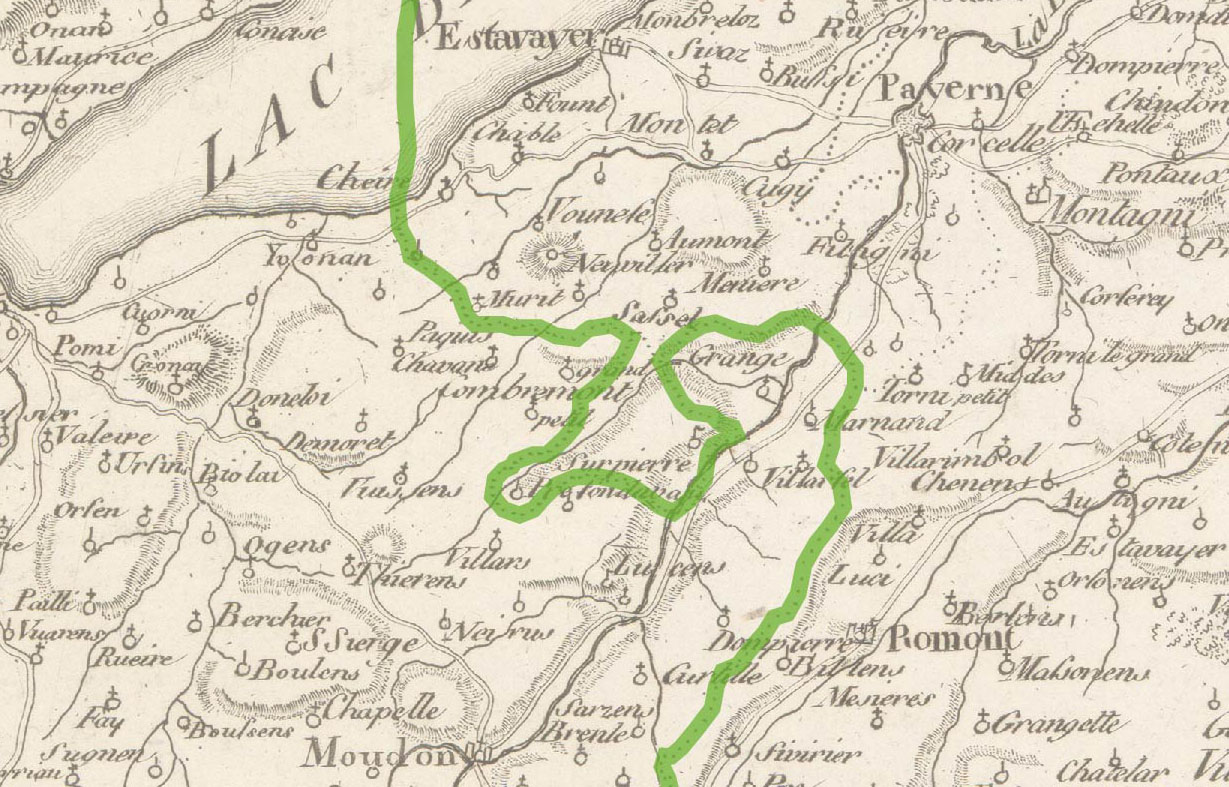 Bei Wegbezeichnungen, die weder den Anfangs- noch den Endpunkt enthalten – zum Beispiel «Chemin de Daillens» – gingen wir davon aus, dass der Weg im Sinne der Klassifizierungsdefinition Gemeinden verbindet, und identifizierten die Verbindung mit den Karten von Mallet, Huber, Woerl etc. Im GIS kennzeichnen wir diese Fälle als nachgewiesene, aber nicht genau lokalisierbare Verbindung.