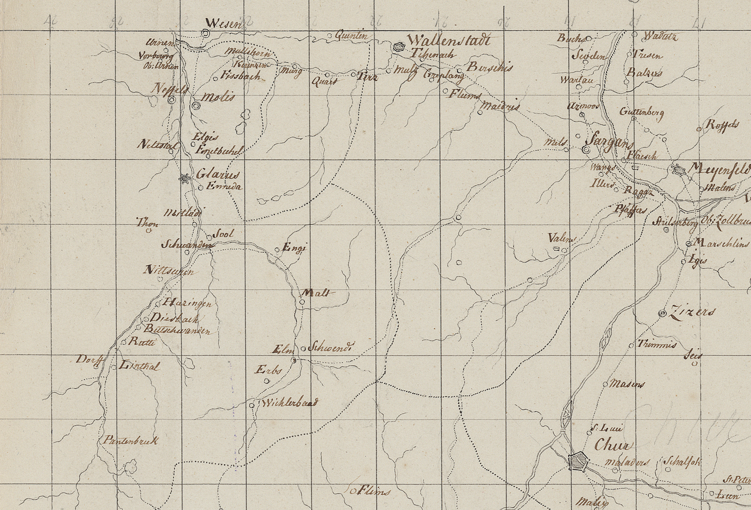 Ausschnitt aus der 1800 oder 1801 entstandenen Manuskriptkarte «Teil von Graubünden und Glarus». Bei dieser handelte es sich wahrscheinlich um eine Grundlage zur geplanten, aber nicht fertig gestellten Schweizerkarte (vgl. dazu «Raumkenntnisse, Kartenwissen»).