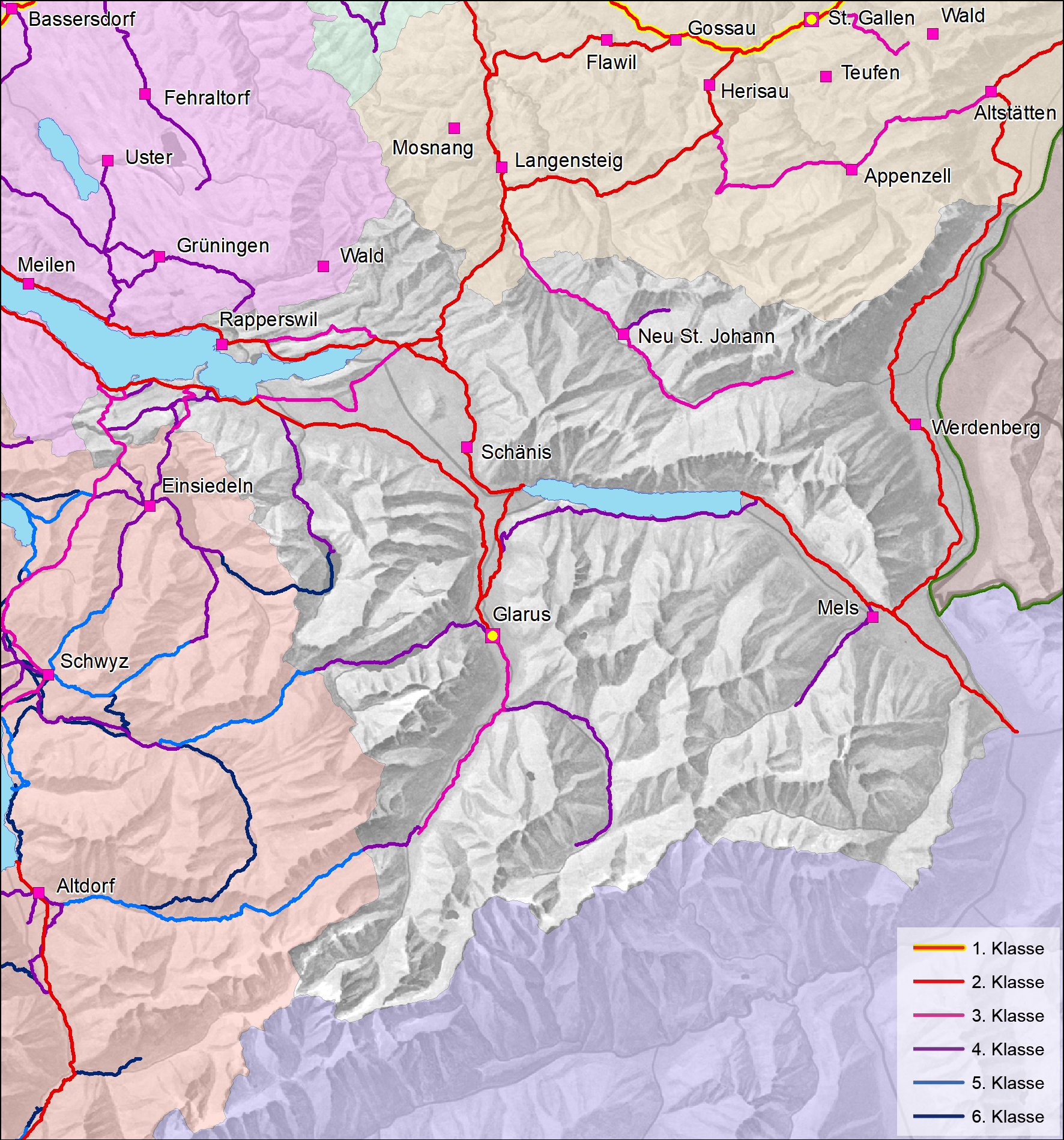 Das grobmaschige Wegnetz der Klassifikation war noch deutlich vom Umstand geprägt, dass im Kanton Linth verschiedene Gebiete zusammengefasst wurden, deren Wege sich vorher relativ unabhängig voneinander entwickelt hatten und die auch in sehr unterschiedlichen Zusammenhängen unterhalten worden waren. Dokumentiert wurden nur die wichtigsten Strassen und Wege der einzelnen Regionen, die aber durchaus in bestimmten überregionalen Verkehrsspannungen ihre besondere Ausprägung erhalten hatten. Letzteres betraf folgende Strassen: