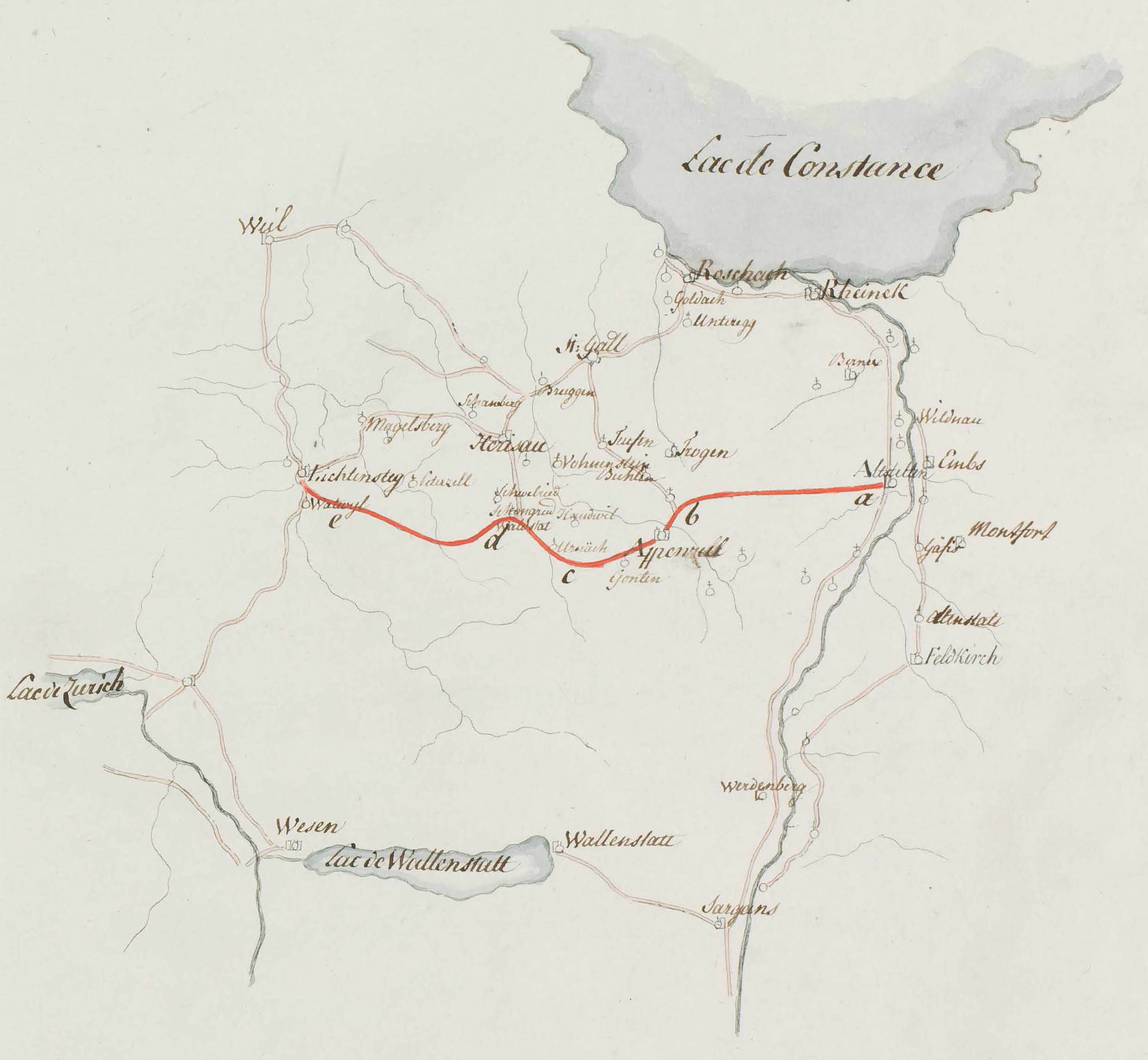 Le Général Jardon ayant besoin d’une plus courte communication, a obligé les habitans du pays d’en ouvrir une l’année dernière, depuis Altstetten à Lichtensteig; on peut la voir tracée en rouge au croquis ci joint, suivant les directions a b c d e.