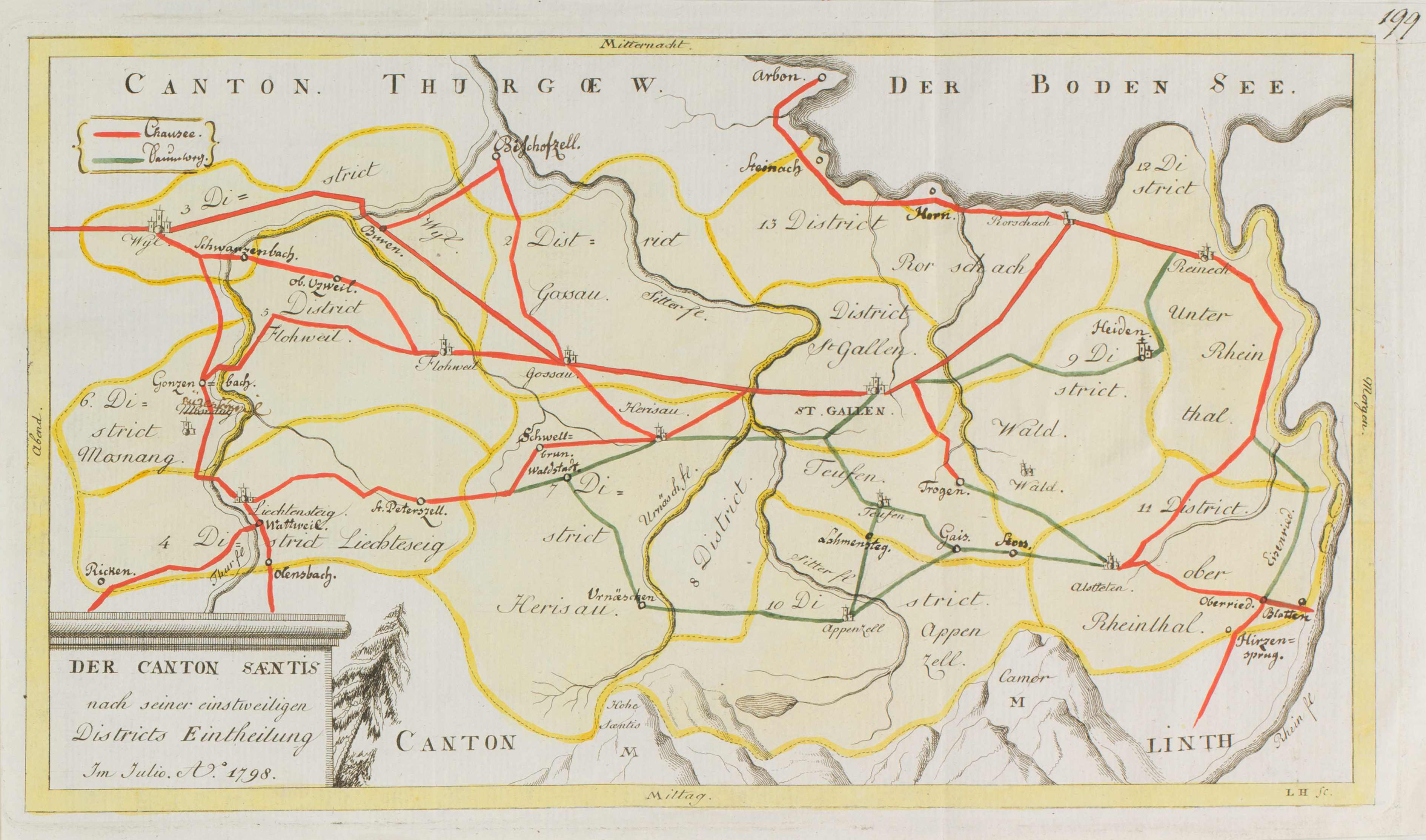 «Der Canton Saentis nach seiner einstweiligen Districts Eintheilung Im Julio Ao 1798», rot die Chausseen, grün die Saumwege. In der Manuskriptkarte sind alle Fahrstrassen als Chausseen bezeichnet. Tatsächlich handelte es sich aber nur bei der Strasse von Elgg über St. Gallen nach Rorschach in bautechnischem Sinne um eine Chaussee.[10]