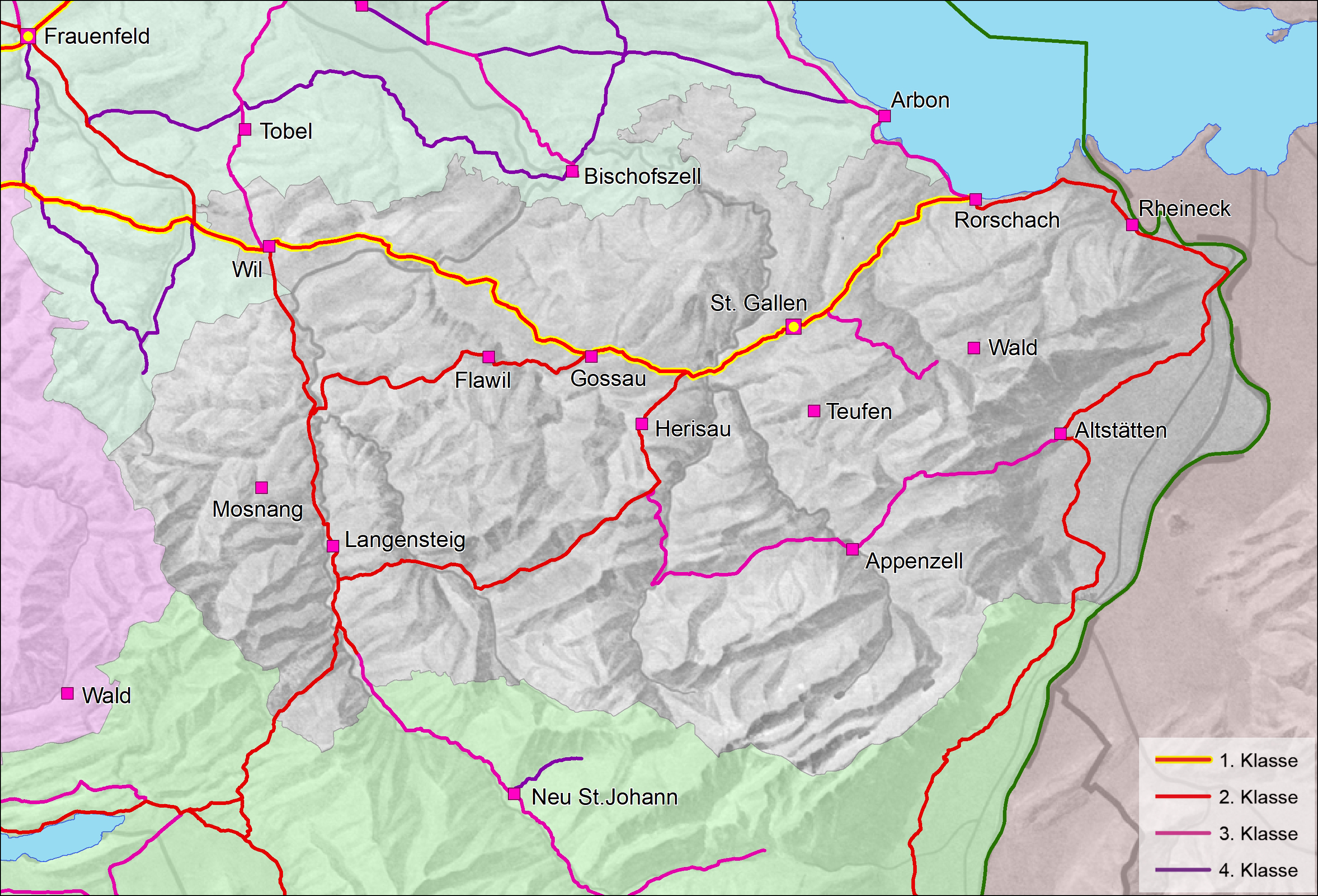 Das Strassennetz des helvetischen Kantons Säntis gemäss Klassifikation von Ende 1800